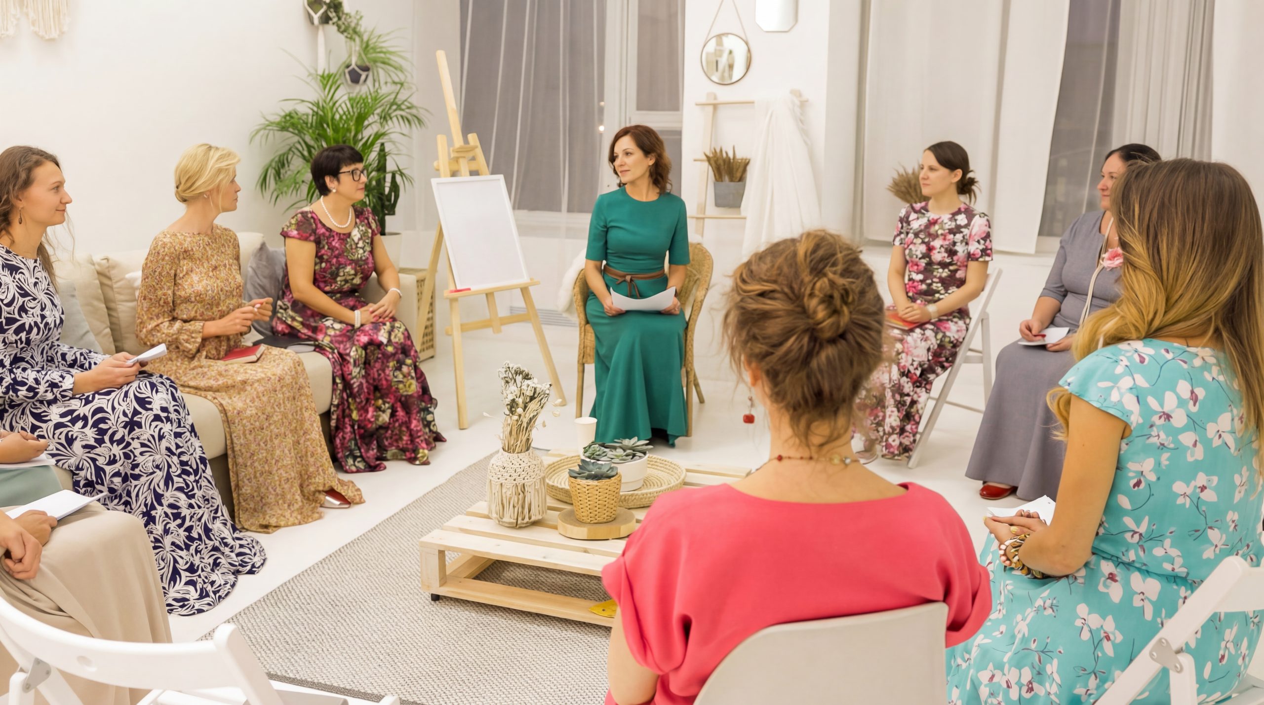Все встречи проходят в атмосфере теплоты, доверия и взаимной поддержки среди единомышленниц. Комфортное групповое пространство помогает чувствовать себя понятым и принятым, проживать свои состояния экологично, делиться и обогащаться чужим опытом, а также получать помощь и опору в непростых ситуациях.